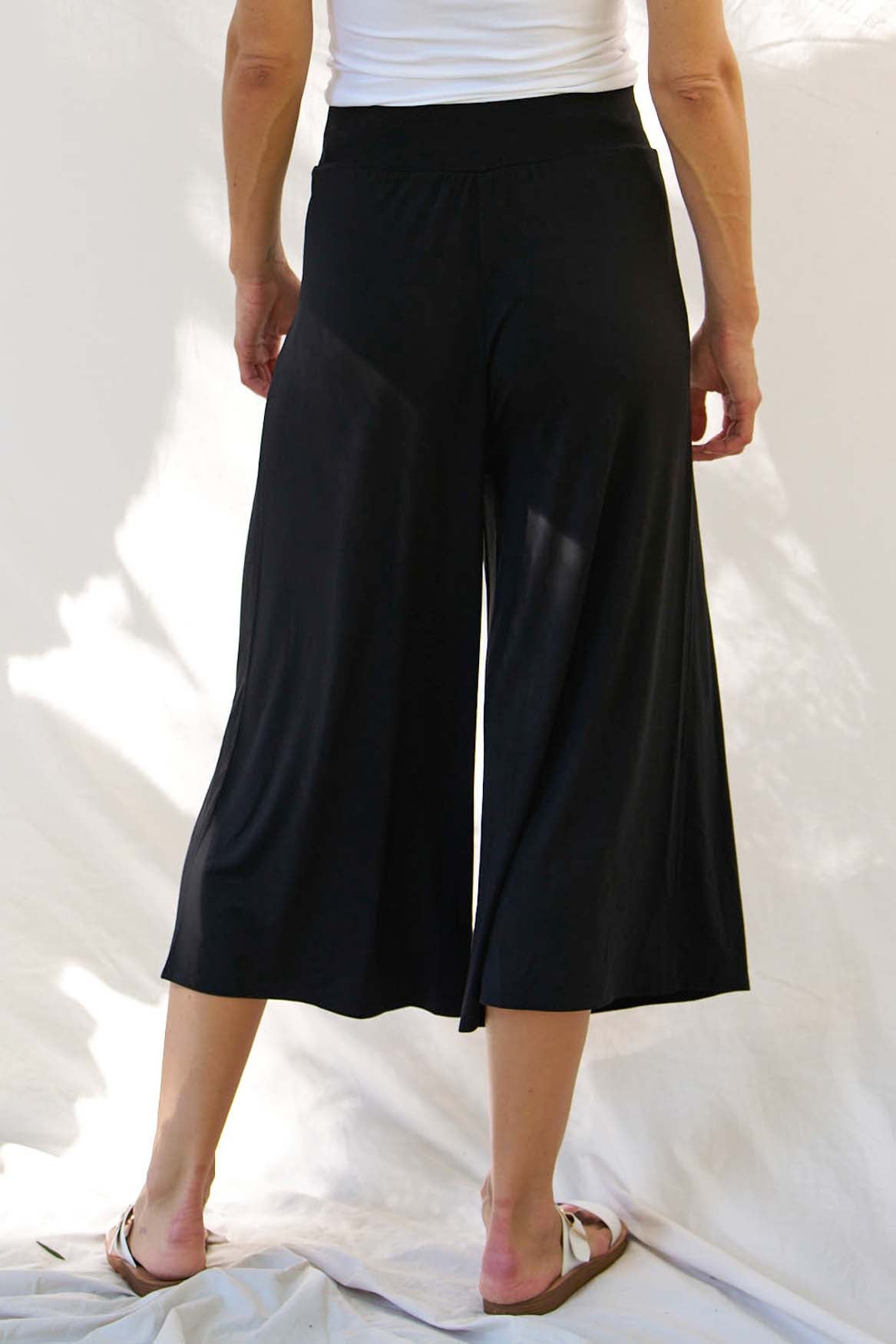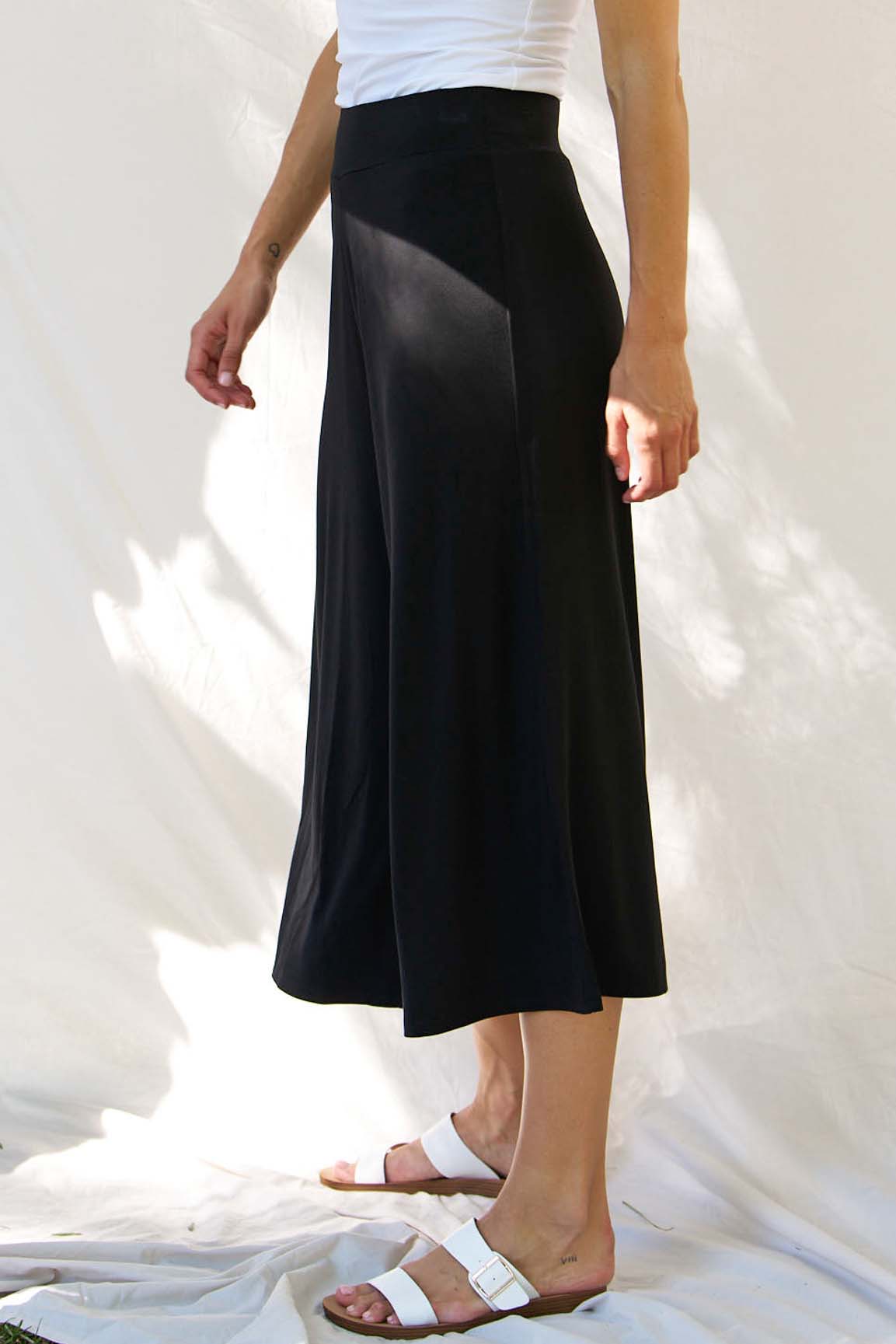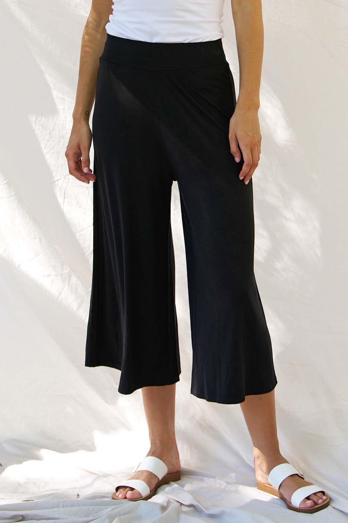 Crafted from a soft bamboo stretch jersey, it features a smooth flat waistband and a flattering mid–high rise. The wide leg silhouette drapes beautifully and finishes at a cropped length for an easy, contemporary feel.